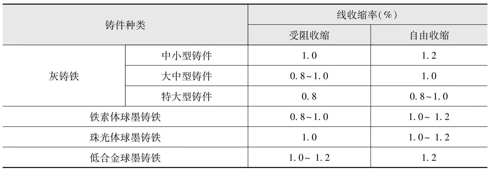 鑄件線收縮率又稱鑄造收縮率,它受鑄件結(jié)構(gòu)形狀、尺寸大小、鑄型退讓性、材料類型及鑄造工藝等諸多因素的影響,灰鑄鐵、球墨鑄鐵鑄件線收縮率可按表-5選取。表-5 鑄件線收縮率選擇