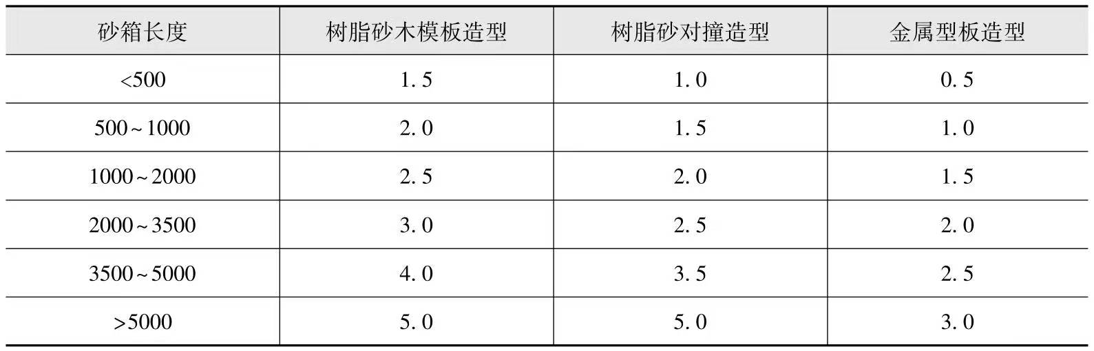 分型負數(shù)可留在上模樣、下模樣或上下模樣各留一半,多箱造型時,每個分型面均應(yīng)留分型負數(shù),處在分型面上的砂芯間隙不能小于該面分型負數(shù)。模樣的分型負數(shù)見表-6。表-6模樣的分型負數(shù) (單位:mm)