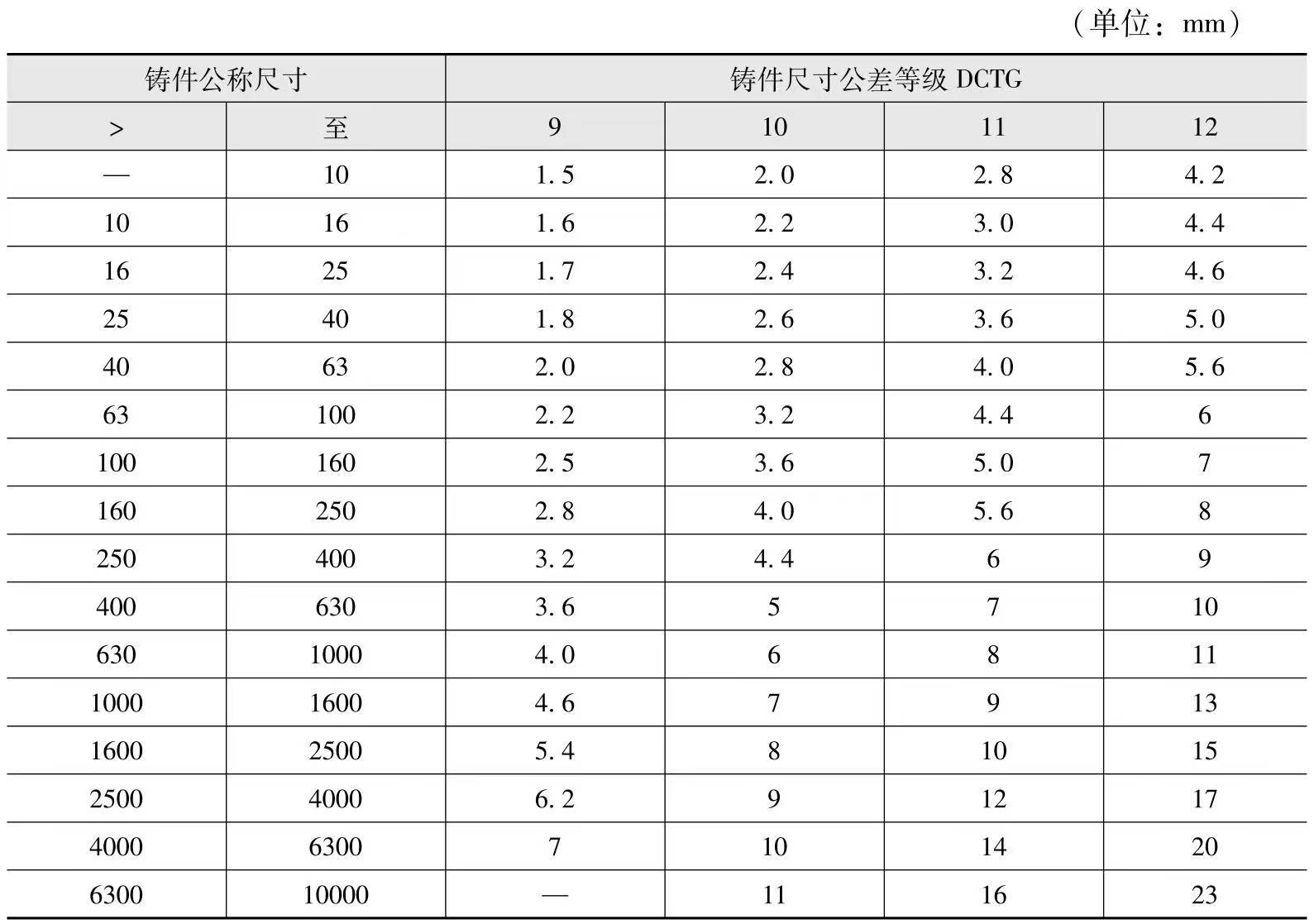 鑄件尺寸公差是指鑄件公稱尺寸的上下極限尺寸之差。代表鑄件尺寸精度的公差級別要求越高,對制造過程影響因素的控制應(yīng)越嚴(yán)格,但鑄件的生產(chǎn)成本也要提高,因此確定鑄件尺寸公差時,必須從實際出發(fā),綜合考慮各種因素,達到既保證鑄件質(zhì)量,又不過多增加生產(chǎn)成本的目的,小批量砂型鑄件尺寸控制參見表-3。表-3 鑄件尺寸公差數(shù)值(摘自GB/T6414—2017,ISO8062)