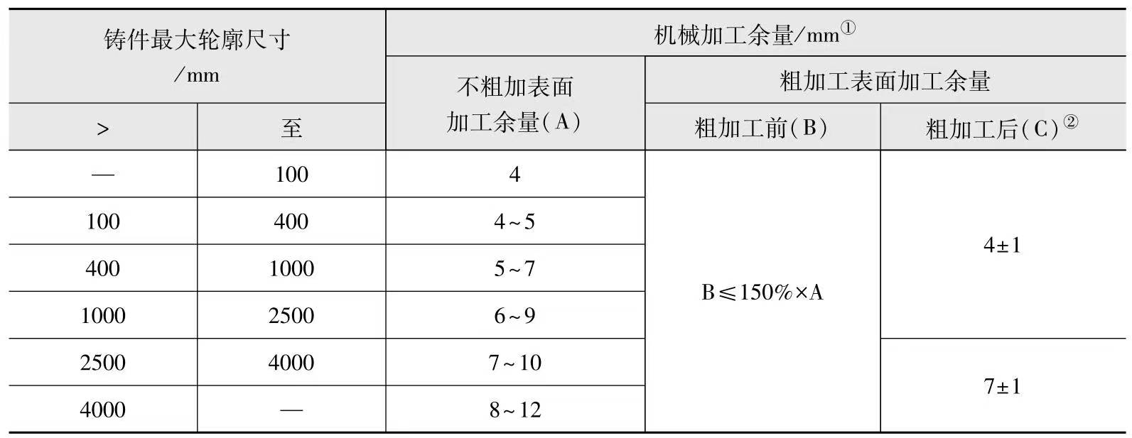 2)粗加工表面加工余量(B)。即顧客要求粗加工或需粗加工驗證鑄件表面的加工余量,該加工余量必須含有在粗加工的余量和提供給顧客的鑄件表面加工余量(C)。機械加工余量可按表-4選取。